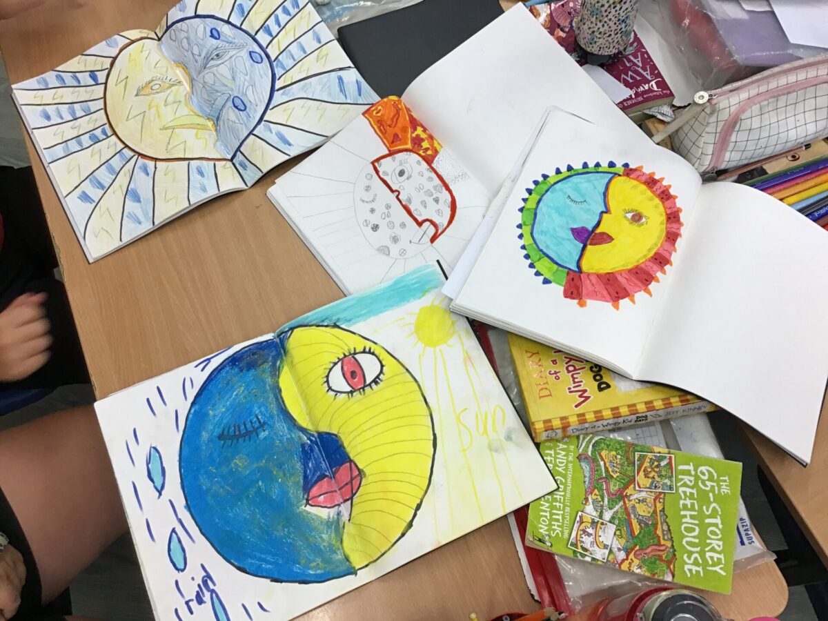 On Wednesday 5th July, after a day at Crispin, we continued our Mexican- themed Creativity Week. We started the morning with some sun and moon artwork. The sun symbolises strength and power (and represented by warm colours), whereas the moon symbolises calmness, beauty and nurturing (represented by cool colours). Then we moved onto adding white paint to our skull and in our sketch books we created a design to go on it.