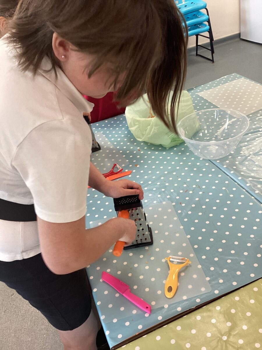 The children practised a range of safe knife techniques, including the bridge position and the claw grip, as well as using a grater confidently and carefully.